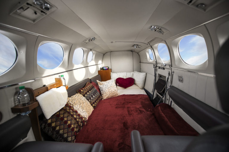 I passasjerkabinen i deres Cessna 421 Golden Eagle er nemlig en gedigen dobbeltseng rigget til med store, fargerike puter som oser av sensualitet.