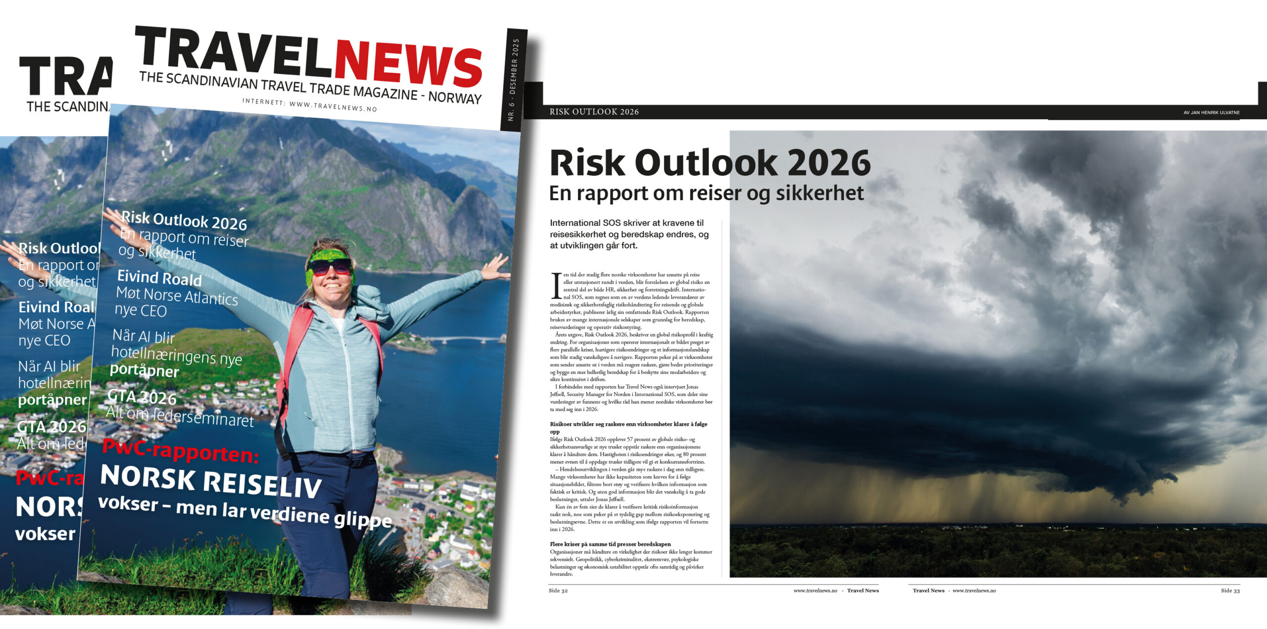 Nytt Travel News ute nå! 0 Møt Eivind Roald, ny CEO i Norse Atlantic, og les om reaksjonene på PwC-rapporten om norsk reiseliv! By Tom Andersson on 15. desember 2025 Nyheter, Turisme I tillegg kan du lese om Risk Outlook 2026, en rapport om reiser og sikkerhet. Få også med deg hvorfor AI er i ferd med å bli hotellnæringens nye portåpner. Dette, og mye mer, finner du i desemberutgaven av Travel News digital. Norse Atlantic reiselivsnyheter Risk
