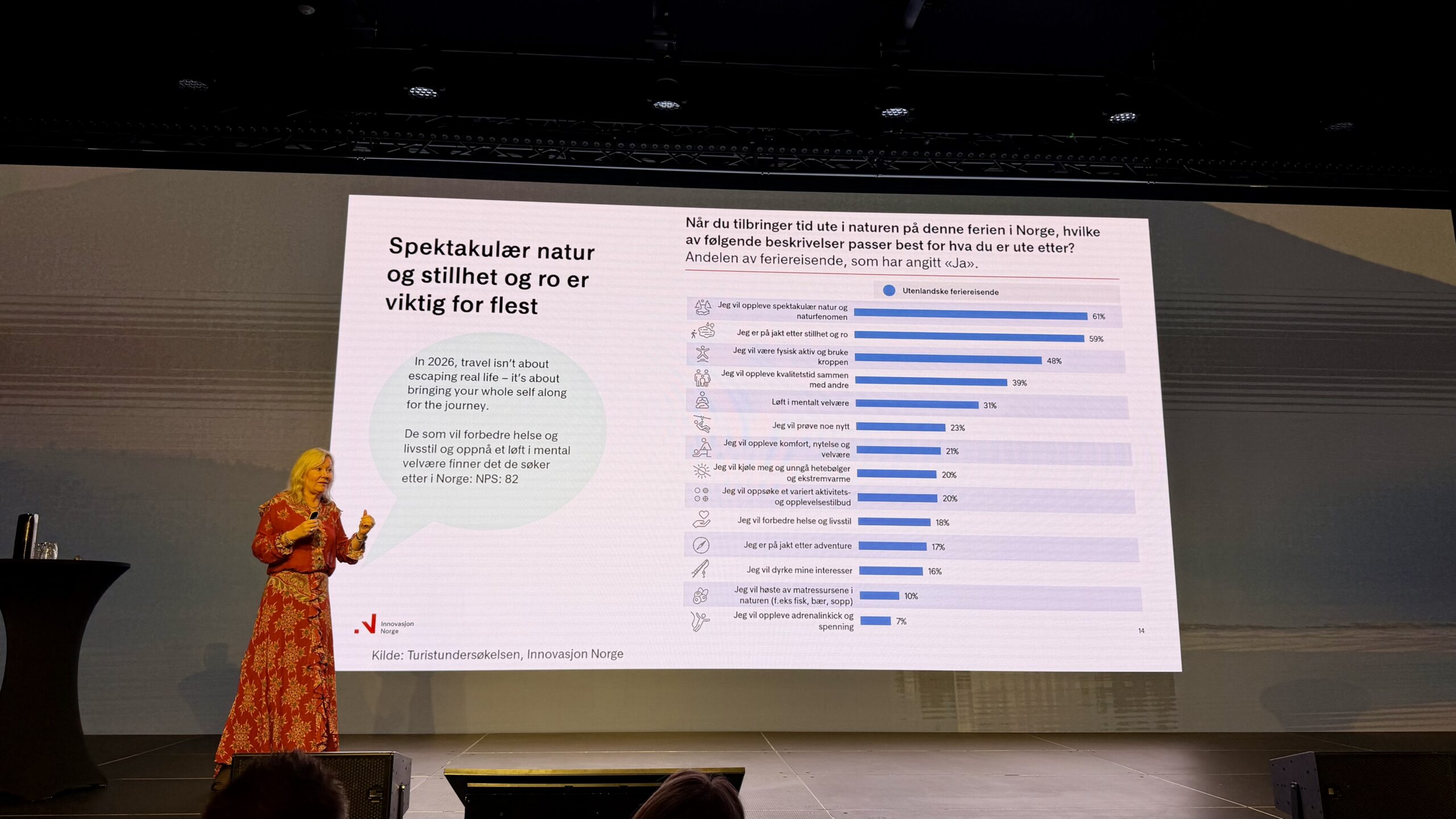 Reiselivsdirektør Aase Marthe Horrigmo åpnet med et tydelig budskap om samarbeid og felles ambisjoner. Hun løftet frem at Norge har hatt stor gjennomslagskraft internasjonalt de siste årene, og at verdensomspennende medieoppmerksomhet har bidratt til å styrke merkevaren Norge som reisemål. Samtidig understreket hun at global konkurranse tiltar, og at sterke resultater krever aktivt samarbeid på tvers av landsdeler, fagmiljøer og markedsaktører gjennom hele året.